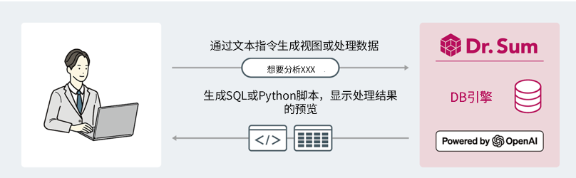 通过文本形式编写想要执行的操作,如生成视图或处理数据, Dr.Sum Copilot通过与 OpenAI 协作生成SQL或Python脚本。