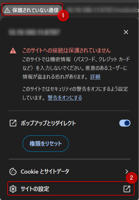 2. 单击地址栏中显示的“保護されていない通信(不安全)”,选择[サイトの設定(网站设置)]。