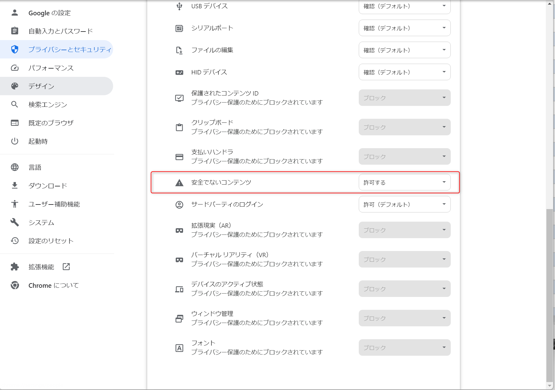 3. 向下滚动右窗格,将[安全ではないコンテンツ(不安全内容)]设置为“許可する(允许)”。