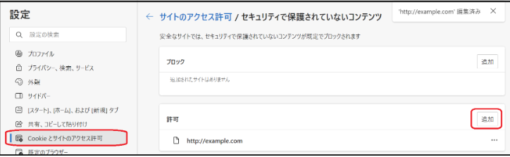 4. 通过“許可(允许)”的“追加(添加)”,添加要设置为例外的网站URL。