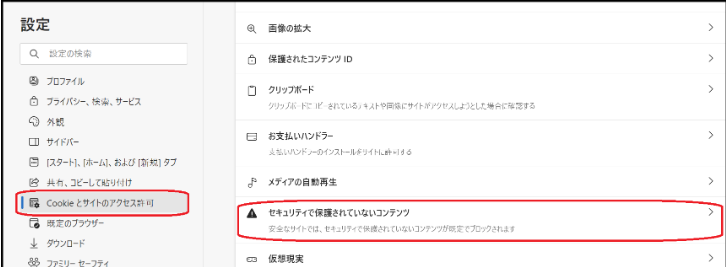 3. 从“Cookieとサイトのアクセス許可(Cookie 和网站权限)”中选择“セキュリティで保護されていないコンテンツ(不安全的内容)”。