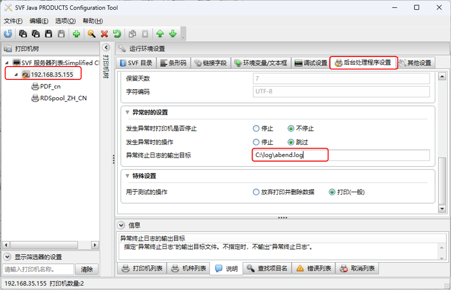 从启动画面的“打印机树”中选择SVF服务器(上述画面中的“192.168.35.155”),并在[后台处理程序设置]选项卡上用绝对路径指定异常终止日志的输出目标。(在下面的屏幕中,“C:\log\abend.log”)