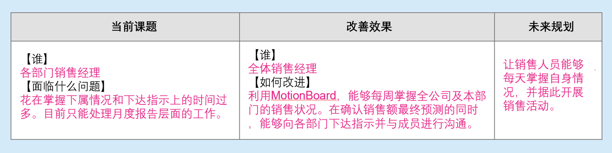 暂且搁置“MotionBoard的功能能否实现”的疑问,集中关注当前面临的课题和希望改进的内容,具体地写下来,以便后续对仪表盘所需功能进行探讨。