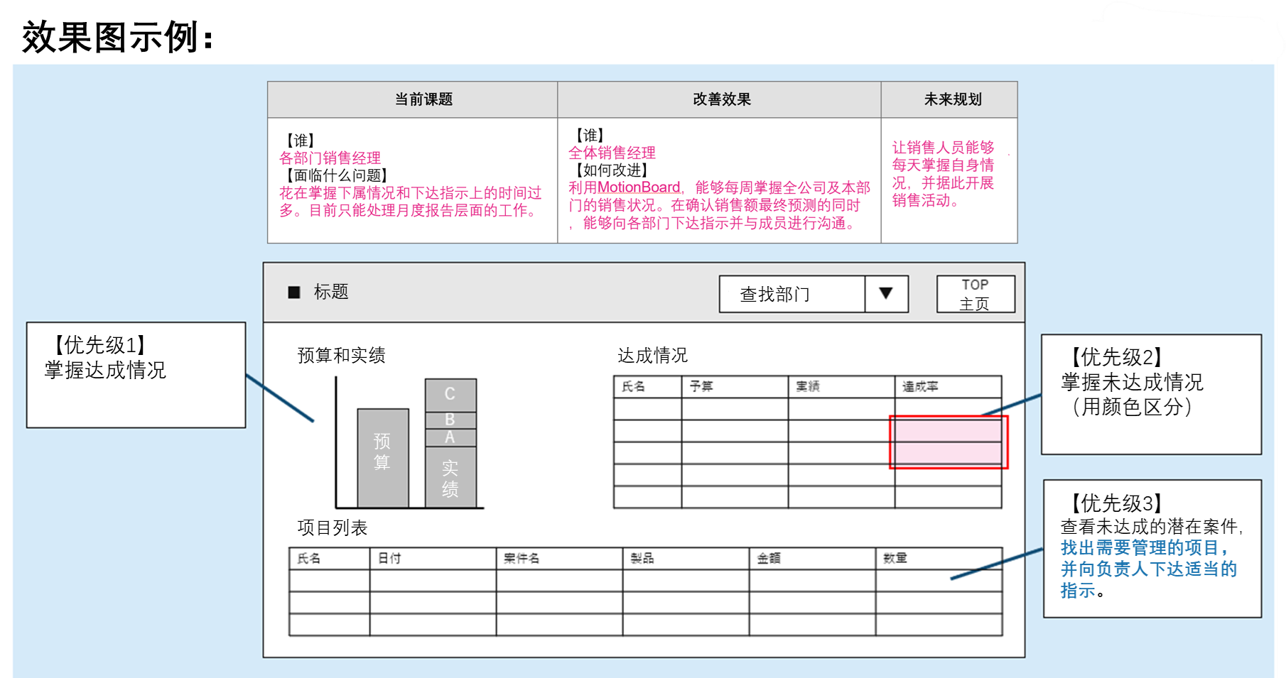 选用MotionBoard是为了实现什么目标?需邀请仪表盘用户共同参与,明确问题点和使用目的。这些问题点和使用目的将成为构思仪表盘设计时的参考依据。在此阶段明确了目标和使用目的,能避免在后续制作仪表盘过程中的迷茫。