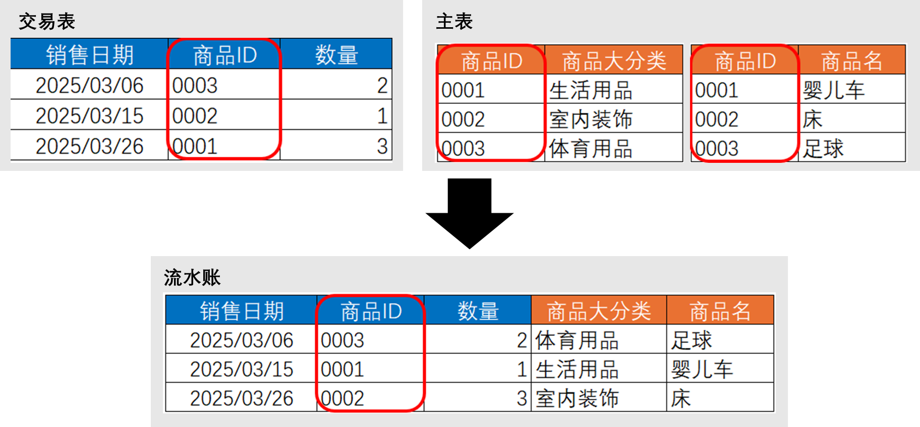 例如,如下图所示,若希望运用实际业绩和预算的交易表以及组织和商品的主数据表,按商品和销售负责人两个维度进行分析,则需将交易表与主数据表整合为一张表,生成流水账数据。